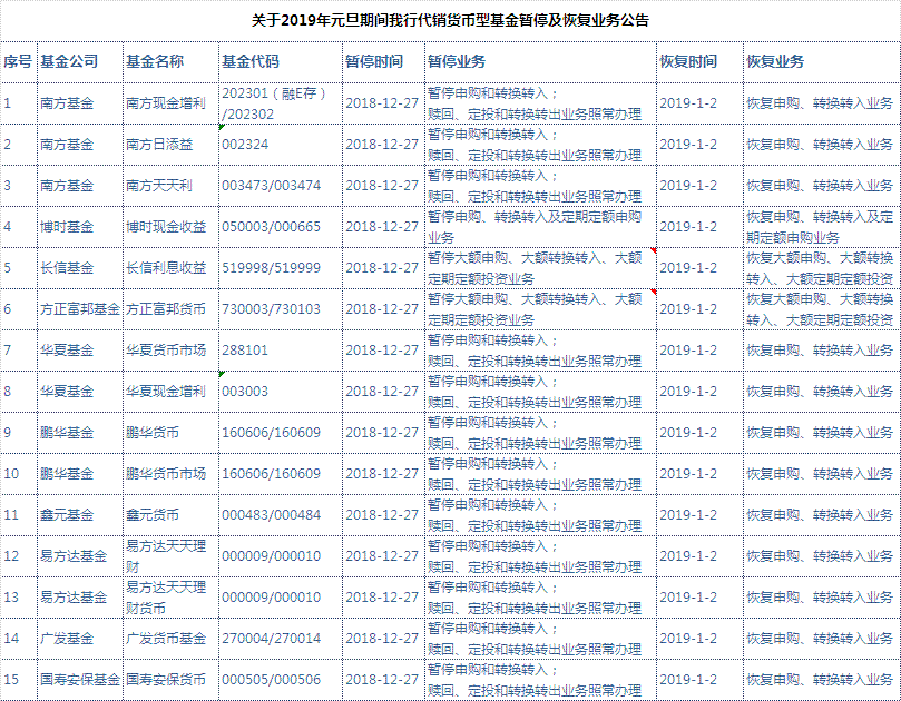 關(guān)于2019年元旦期間我行代銷貨幣型基金暫停及恢復(fù)業(yè)務(wù)公告