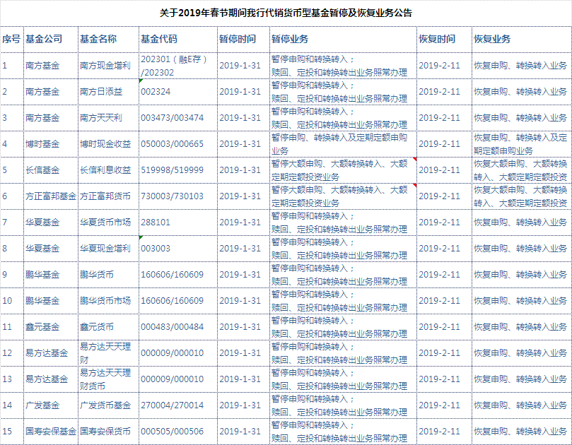 關(guān)于2019年春節(jié)期間我行代銷(xiāo)貨幣型基金暫停及恢復(fù)業(yè)務(wù)公告