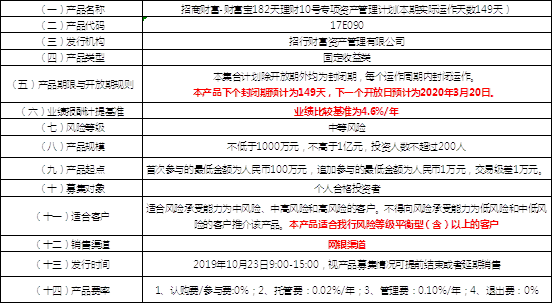 我行將于2019年10月23日代銷《招商財(cái)富-財(cái)富寶182天理財(cái)10號(hào)專項(xiàng)資產(chǎn)管理計(jì)劃(本期實(shí)際運(yùn)作天數(shù)149天)》,產(chǎn)品募集期2019年10月23日