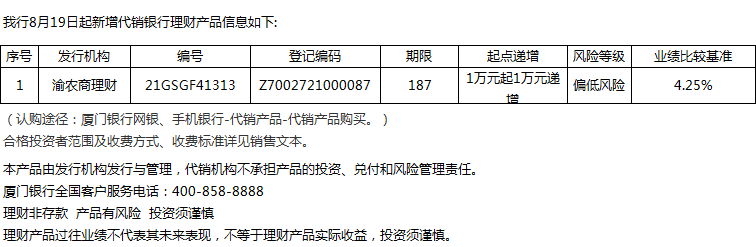 廈門銀行8月19日代銷渝農(nóng)商理財(cái)理財(cái)產(chǎn)品信息