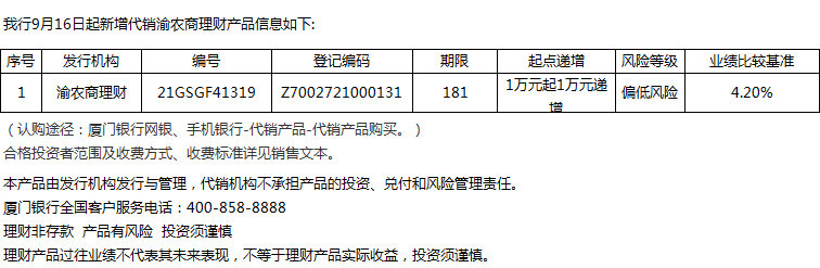 廈門銀行9月16日代銷渝農(nóng)商理財產(chǎn)品信息