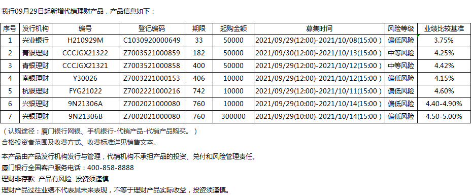 廈門銀行09月29日代銷理財(cái)產(chǎn)品發(fā)行信息
