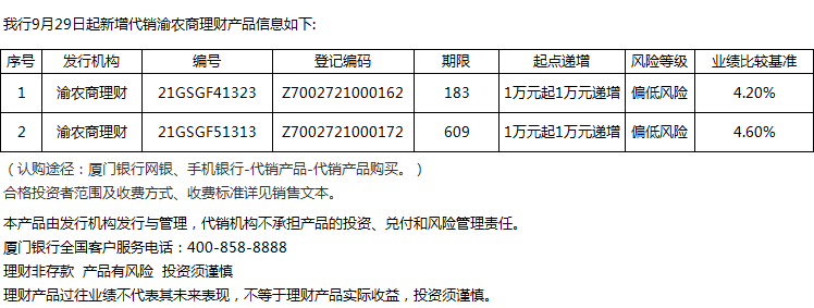 廈門銀行9月29日代銷渝農(nóng)商理財(cái)產(chǎn)品信息