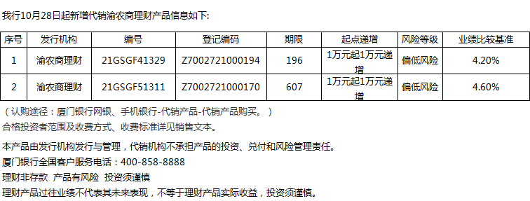 廈門銀行10月28日代銷渝農(nóng)商理財(cái)產(chǎn)品信息