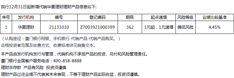 廈門銀行12月31日代銷華夏理財(cái)理財(cái)產(chǎn)品信息