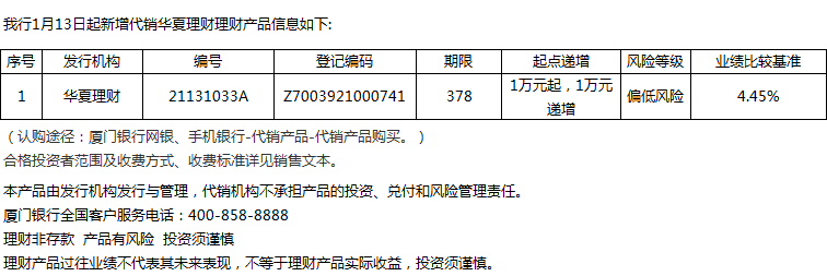 廈門(mén)銀行1月13日代銷(xiāo)華夏理財(cái)理財(cái)產(chǎn)品信息