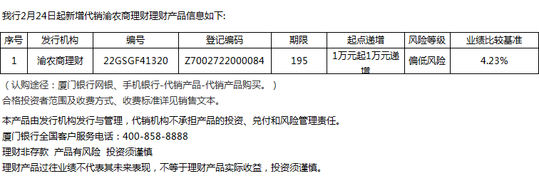 廈門銀行2月24日代銷渝農商理財理財產品信息