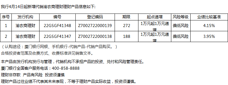 廈門銀行4月14日代銷渝農(nóng)商理財理財產(chǎn)品信息