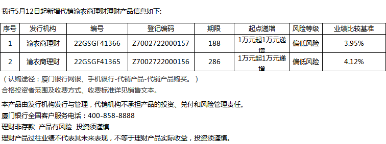 廈門銀行5月12日代銷渝農(nóng)商理財(cái)理財(cái)產(chǎn)品信息