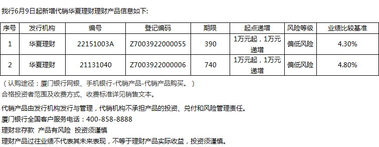 廈門銀行6月9日代銷華夏理財理財產(chǎn)品信息