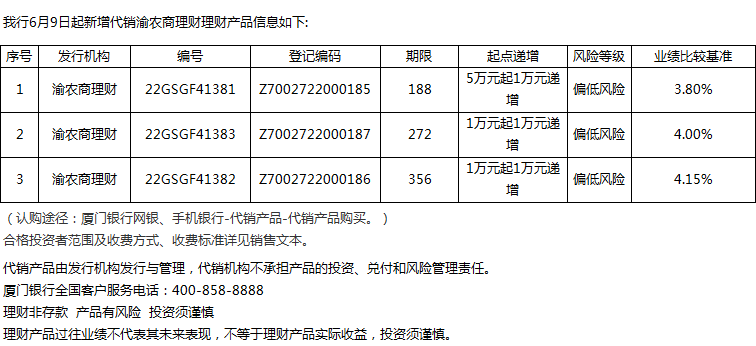 廈門(mén)銀行6月9日代銷(xiāo)渝農(nóng)商理財(cái)理財(cái)產(chǎn)品信息
