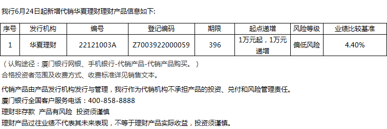 廈門(mén)銀行6月24日代銷華夏理財(cái)理財(cái)產(chǎn)品信息