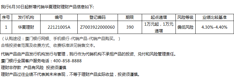 廈門(mén)銀行6月30日代銷(xiāo)華夏理財(cái)理財(cái)產(chǎn)品信息