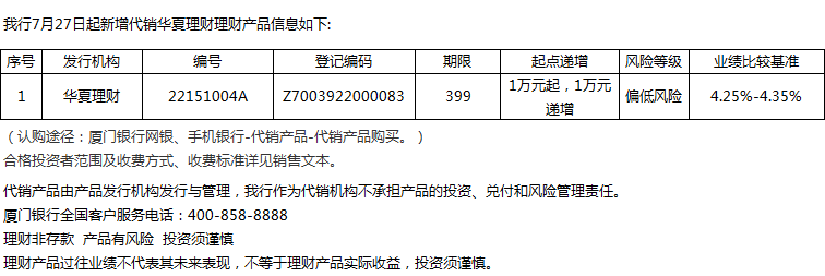 廈門銀行7月27日代銷華夏理財理財產(chǎn)品信息