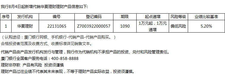 廈門銀行8月4日代銷華夏理財(cái)理財(cái)產(chǎn)品信息