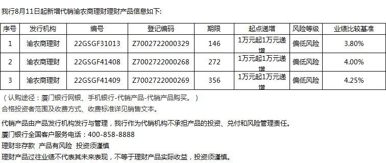 廈門銀行8月11日代銷渝農(nóng)商理財(cái)理財(cái)產(chǎn)品信息