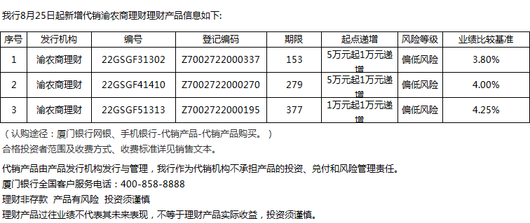 廈門銀行8月25日代銷渝農(nóng)商理財理財產(chǎn)品信息