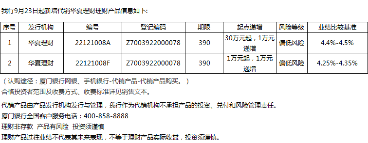 廈門銀行9月23日代銷華夏理財(cái)理財(cái)產(chǎn)品信息