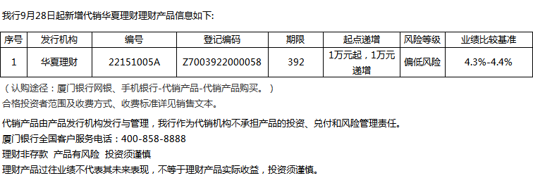 廈門銀行9月28日代銷華夏理財理財產(chǎn)品信息