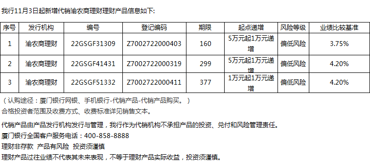 廈門銀行11月3日代銷渝農(nóng)商理財(cái)理財(cái)產(chǎn)品信息