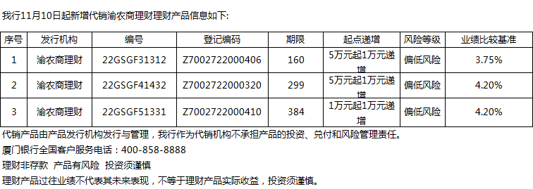 廈門銀行11月10日代銷渝農(nóng)商理財(cái)理財(cái)產(chǎn)品信息