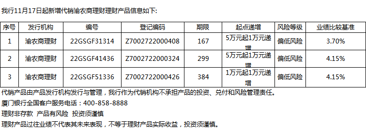 廈門銀行11月17日代銷渝農(nóng)商理財(cái)理財(cái)產(chǎn)品信息