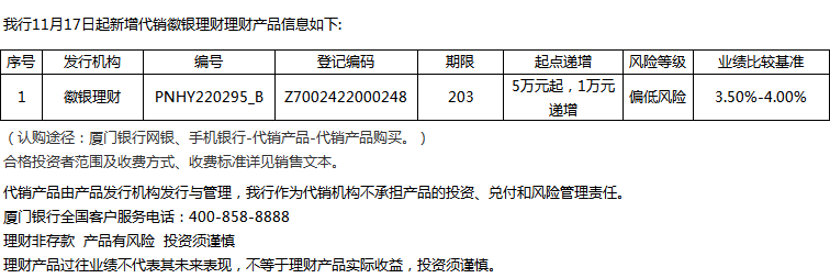 廈門(mén)銀行11月17日代銷(xiāo)徽銀理財(cái)理財(cái)產(chǎn)品信息