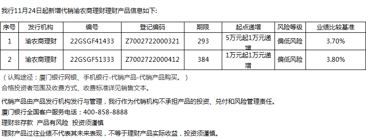 廈門銀行11月24日代銷渝農(nóng)商理財理財產(chǎn)品信息