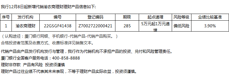 廈門銀行12月8日代銷渝農(nóng)商理財理財產(chǎn)品信息