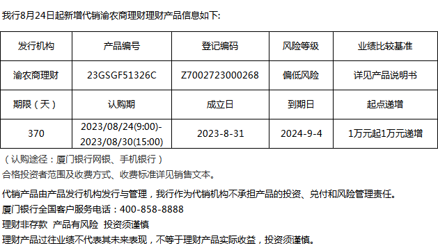 廈門銀行8月24日代銷渝農(nóng)商理財(cái)理財(cái)產(chǎn)品信息