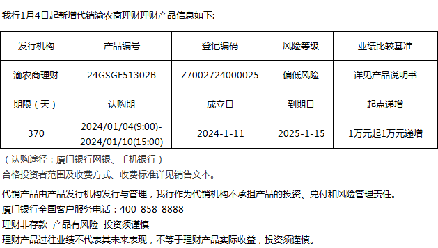 廈門銀行1月4日代銷渝農商理財理財產品信息