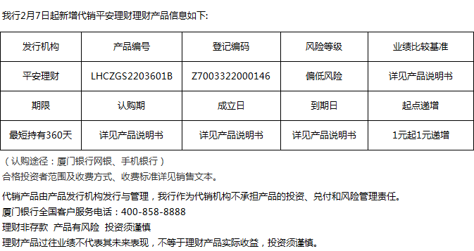 廈門銀行2月7日代銷平安理財理財產品信息