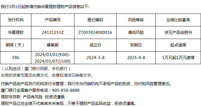 廈門銀行3月1日代銷華夏理財理財產品信息