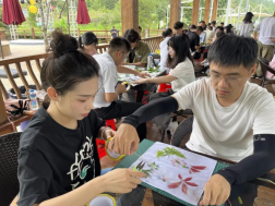 雙人手工DIY拓印活動中,學員們收集了梅花山上散落的樹葉、花朵等,將汁液拓在帆布袋上,充分發(fā)揮想象力和創(chuàng)造力,創(chuàng)作出只屬于兩人的手工作品,增強了彼此間的合作默契,更加深了對彼此的了解。