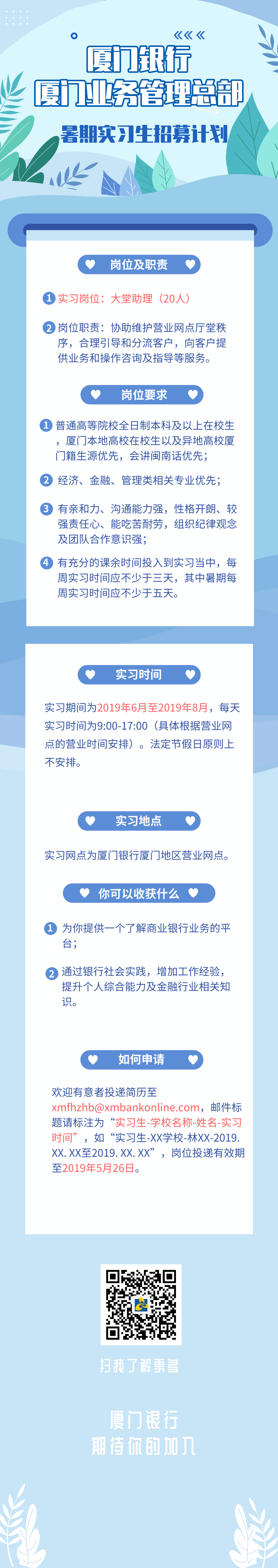 廈門銀行暑期實(shí)習(xí)生招募計(jì)劃現(xiàn)已啟動(dòng),快來(lái)投簡(jiǎn)歷吧!