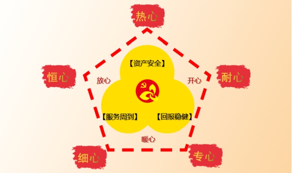 海滄支行黨支部全體黨員先鋒及全體員工將“五心”精神落到工作實(shí)處。業(yè)務(wù)團(tuán)隊(duì)始終做到了“資產(chǎn)安全+周到服務(wù)”讓客戶“放心”,“資產(chǎn)安全+回報(bào)穩(wěn)健”讓客戶“開(kāi)心”,“服務(wù)周到+回報(bào)穩(wěn)健”讓客戶“暖心”。