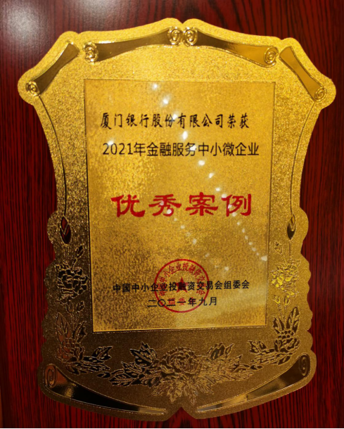 9月10日,第九屆中國中小企業(yè)投融資交易會暨2021“小企業(yè)大夢想”高峰論壇在北京國家會議中心隆重舉行,大會發(fā)布了2021年金融服務(wù)中小微企業(yè)案例征集活動入圍案例,廈門銀行《增信基金業(yè)務(wù):創(chuàng)新服務(wù)模式 踐行普惠金融》成功入圍并榮獲優(yōu)秀案例。本次活動由國家發(fā)展和改革委員會批準,中國中小企業(yè)協(xié)會發(fā)起,聯(lián)合中國銀行業(yè)協(xié)會、中國期貨業(yè)協(xié)會等國家級行業(yè)協(xié)會共同舉辦,廈門業(yè)務(wù)管理總部黃煒杰副總監(jiān)代表我行應(yīng)邀參加領(lǐng)取獎狀。