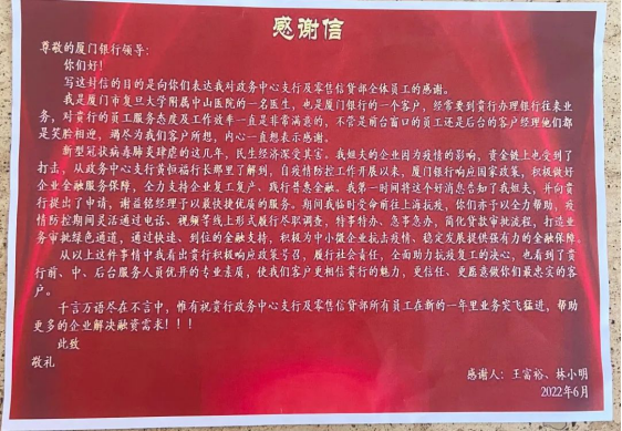“今年4月份,我姐夫的企業(yè)因?yàn)橐咔榈挠绊?,資金鏈上受到了打擊,期間我臨時(shí)受命前往上海馳援抗“疫”,廈門銀行予以了全力幫助,通過綠色審查通道履行信貸審查,特事特辦、急事急辦,為我姐夫的企業(yè)解決了融資難題。同時(shí)我也是廈門銀行的一位客戶,對銀行的服務(wù)態(tài)度及工作效率一直是非常滿意的,員工們都是笑臉相迎,竭盡為我們客戶所想,內(nèi)心一直想表示感謝,給你們點(diǎn)贊!”林醫(yī)生和的千言萬語匯成“感謝”二字。
