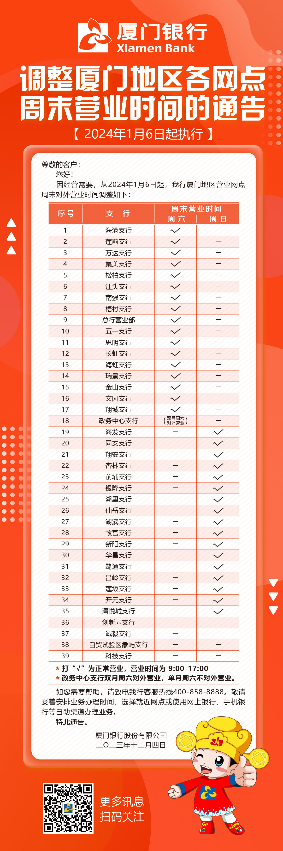 廈門銀行關(guān)于調(diào)整廈門地區(qū)各網(wǎng)點(diǎn)周末營業(yè)時(shí)間的通告