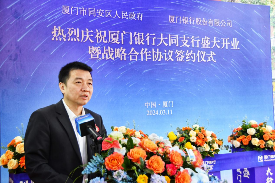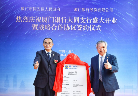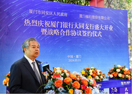 2024年3月11日,廈門銀行大同支行對(duì)外揭牌開業(yè)。開業(yè)儀式上,廈門銀行與廈門市同安區(qū)人民政府簽署戰(zhàn)略合作協(xié)議。廈門市同安區(qū)人民政府常務(wù)副區(qū)長(zhǎng)李祖光、廈門市同安區(qū)財(cái)政局局長(zhǎng)林曉龍、廈門市同安區(qū)工業(yè)與信息化局局長(zhǎng)徐火祥、廈門市同安區(qū)建設(shè)與交通局局長(zhǎng)葉國(guó)生、廈門市同安區(qū)人力資源與社會(huì)保障局局長(zhǎng)梁永忠、廈門銀行行長(zhǎng)吳昕顥、副行長(zhǎng)兼廈門銀行廈門業(yè)務(wù)管理總部總監(jiān)莊海波等出席簽約儀式。