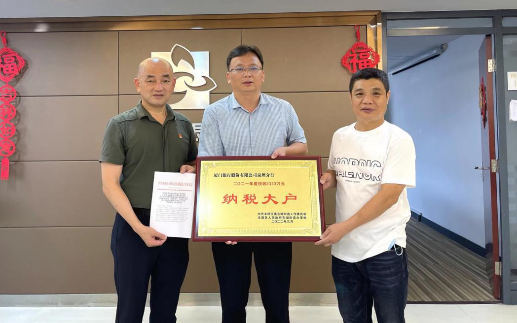 2022年6月6日,泉州分行以2021年度納稅2333萬元人民幣的成績獲得中共豐澤區(qū)委東湖街道工作委員會及豐澤區(qū)人民政府東湖街道辦事處授予“納稅大戶”榮譽(yù)表彰。