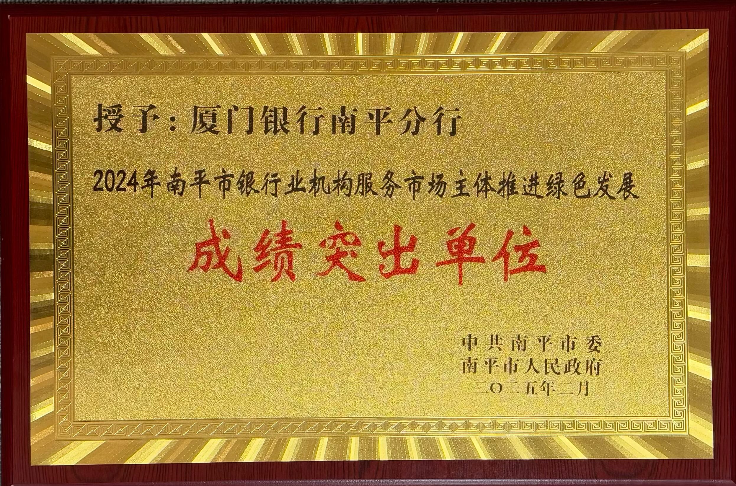 根據(jù)《南平市銀行業(yè)機(jī)構(gòu)服務(wù)市場主體推進(jìn)綠色發(fā)展評價辦法》,經(jīng)綜合評價,廈門銀行南平分行獲評“2024年南平市銀行業(yè)機(jī)構(gòu)服務(wù)市場主體推進(jìn)綠色發(fā)展成績突出單位”。廈門銀行南平分行連續(xù)兩年獲得該項表揚(yáng),肯定了我行在南平市銀行業(yè)機(jī)構(gòu)服務(wù)市場主體、推進(jìn)綠色發(fā)展工作中取得優(yōu)異表現(xiàn),也激勵著我行繼續(xù)為南平市全方位綠色高質(zhì)量發(fā)展做出更多貢獻(xiàn)。