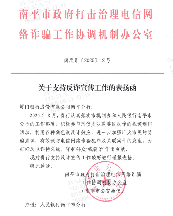 2025年9月,南平分行收到南平市政府打擊治理電信網(wǎng)絡(luò)詐騙工作協(xié)調(diào)機(jī)制辦公室表揚(yáng)函,對我行認(rèn)真落實(shí)南平市機(jī)制辦與人民銀行南平市分行的工作部署,積極參反詐視頻制作活動,對接反詐中心工作成績突出,為守護(hù)群眾“錢袋子”作出貢獻(xiàn)予以肯定與表揚(yáng)。