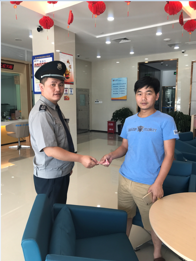 2017年7月19日,莆田城廂支行安保人員在按規(guī)定巡視營業(yè)大廳時,突然發(fā)現(xiàn)2號柜客戶椅上有張百元現(xiàn)鈔,他立即報告了營業(yè)部主任。