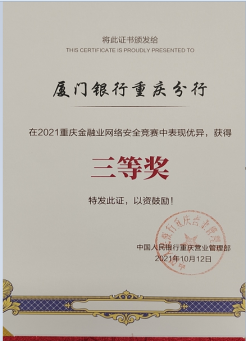 廈門銀行重慶分行榮獲2021年重慶金融業(yè)網(wǎng)絡(luò)安全競(jìng)賽”三等獎(jiǎng)”
