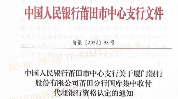 莆田分行成功取得國庫集中收付代理銀行資格