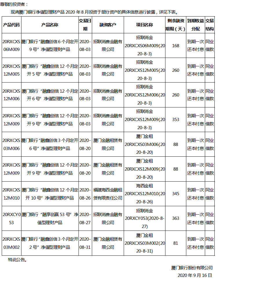 關(guān)于廈門銀行凈值型理財產(chǎn)品2020年8月投資部分資產(chǎn)的公告