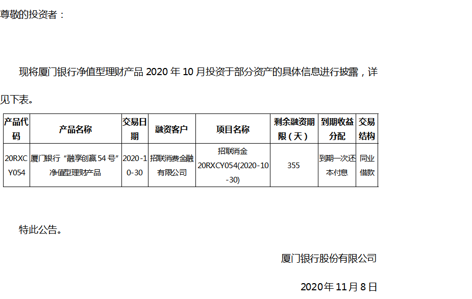 關(guān)于廈門銀行凈值型理財產(chǎn)品2020年10月投資部分資產(chǎn)的公告