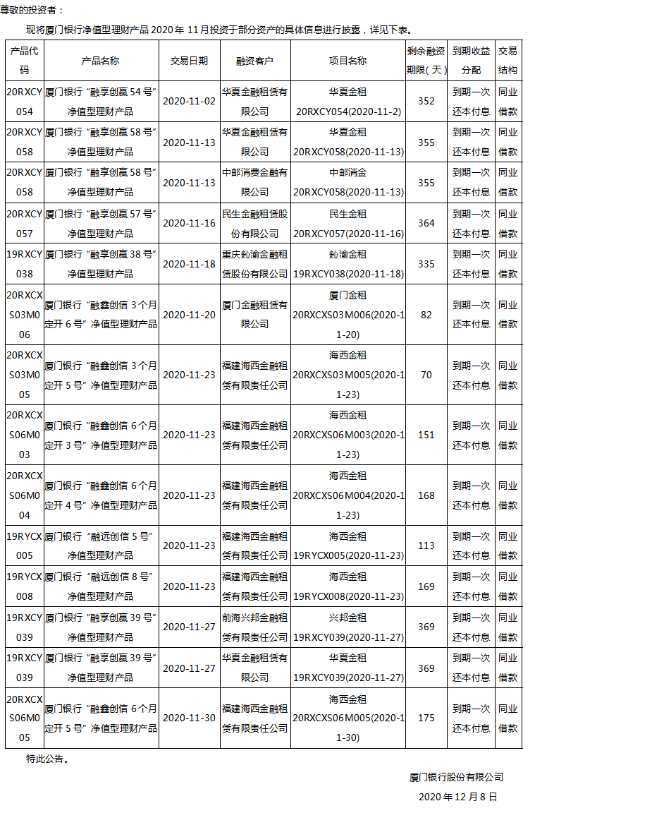 關(guān)于廈門(mén)銀行凈值型理財(cái)產(chǎn)品2020年11月投資部分資產(chǎn)的公告