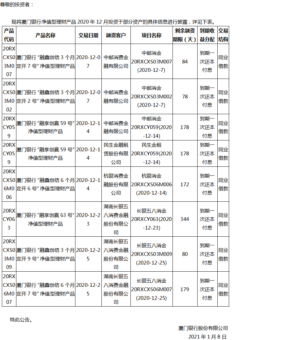 關(guān)于廈門銀行凈值型理財(cái)產(chǎn)品2020年12月投資部分資產(chǎn)的公告